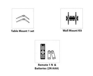 - Mounting Hardware 1 TV, 1 Remote Control, 1 Wall Bracket, 1 Stand, 1 Power Cable, 2 AAA Battery